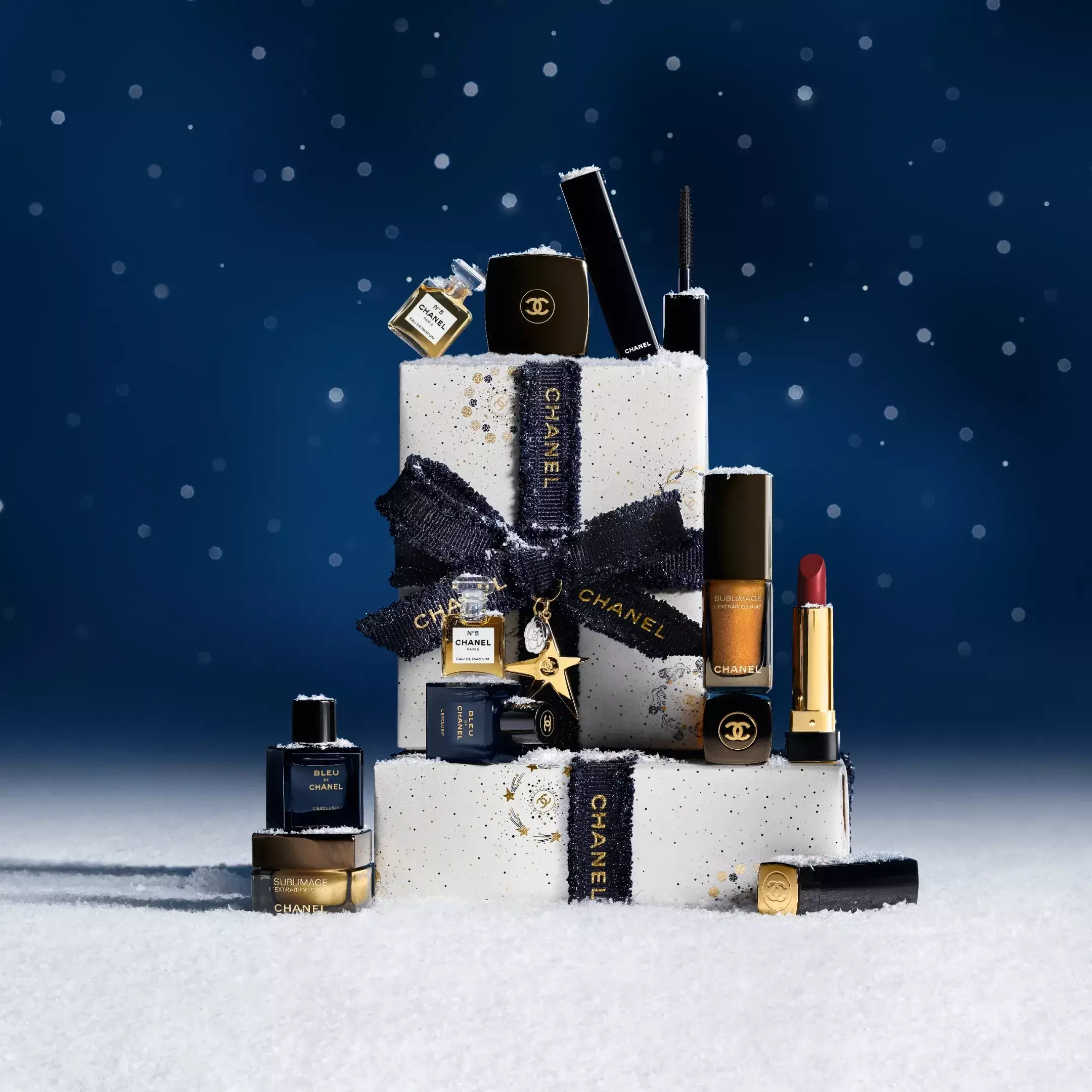 CHANEL 的節慶禮盒常常一上市就被秒搶,除了 Chance、No.5、Bleu de Chanel 等經典香水延伸的隨身噴霧組、髮香組之外,也有美妝與香氛綜合的精選禮盒。加上 Chanel 的星辰與深藍包裝設計,整體非常有收藏價值。